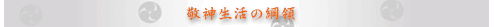 神道は天地悠久の大道であって、崇高なる精神を培ひ、太平を開くの基である。 神慮を畏み祖訓をつぎ、いよいよ道の精華を発揮し、人類の福祉を増進するは、使命を 達成する所以である。ここにこの綱領をかかげて向かふところを明らかにし、実践につ とめて以て大道を宣揚することを期する。 一、神の恵みと祖先の恩とに感謝し、明き清きまことを以て祭祀にいそしむこと 一、世のため人のために奉仕し、神のみこともちとして世をつくり固め成すこと 一、大御心をいただきてむつび和らぎ、国の隆昌と世界の共存共栄とを祈ること |